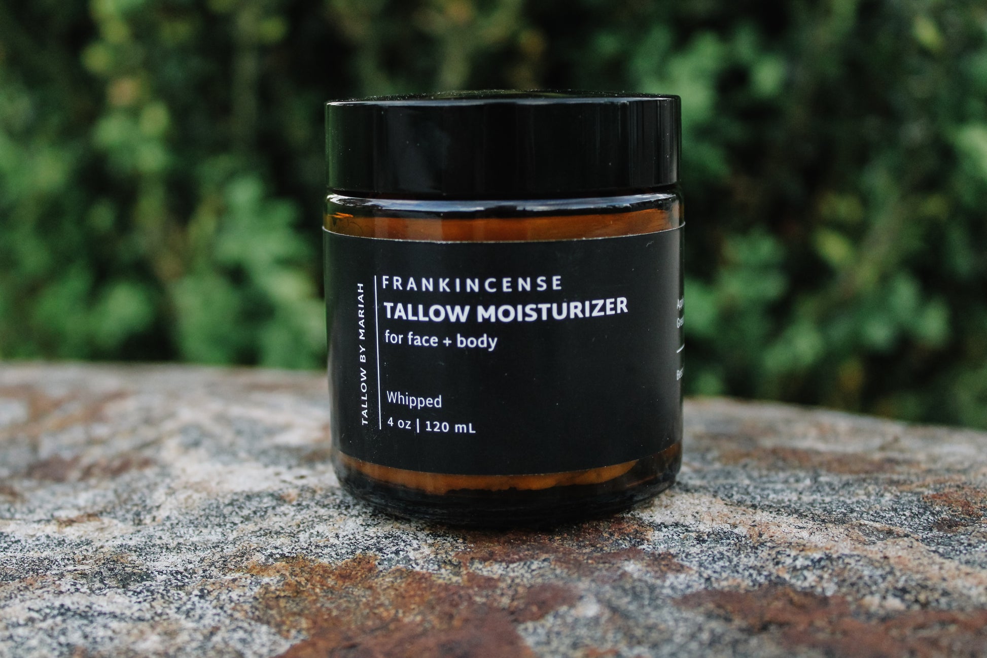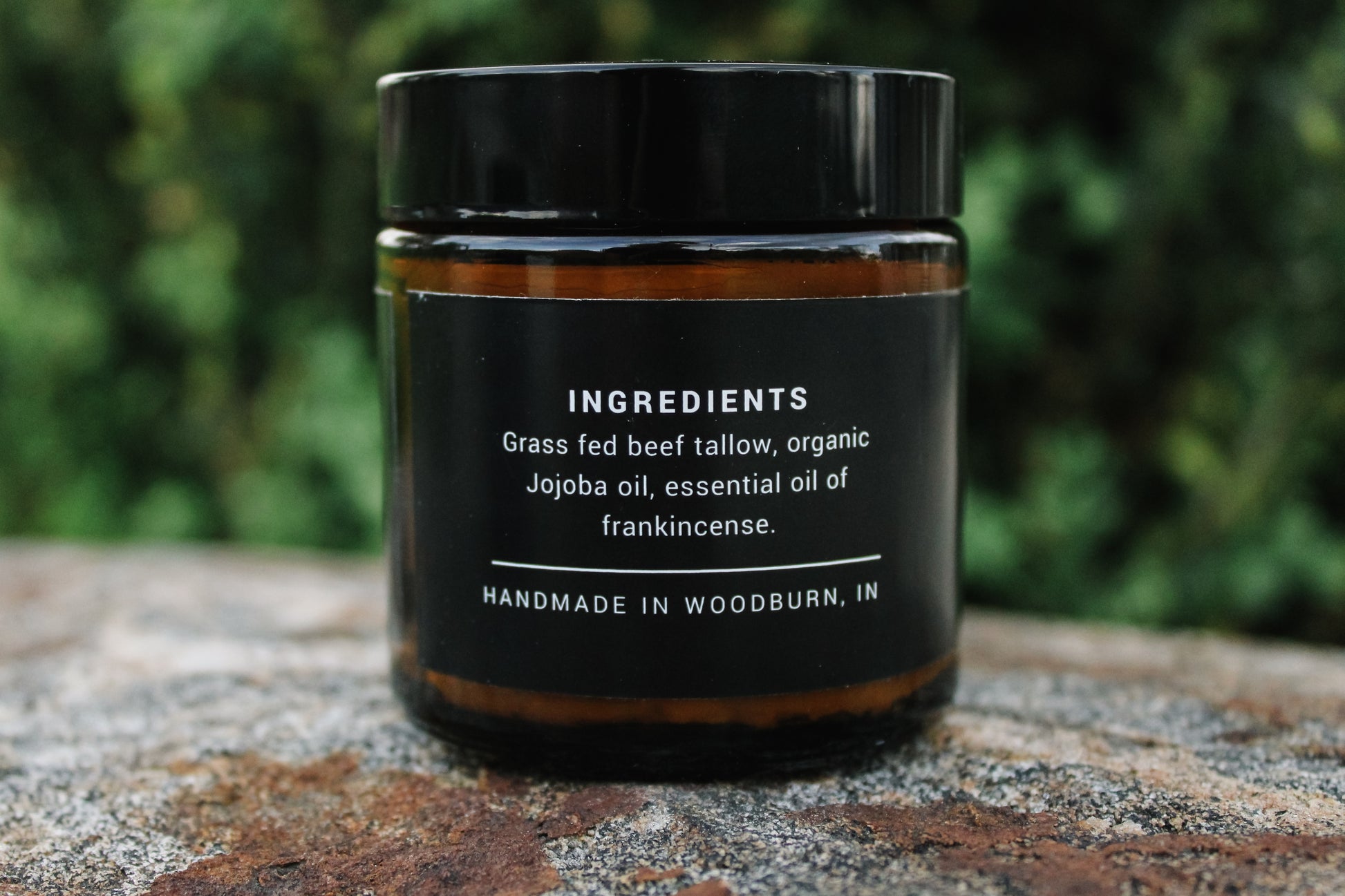 100% grass-fed + regenerative farmed beef tallow, organic jojoba oil, essential oil of frankincense.